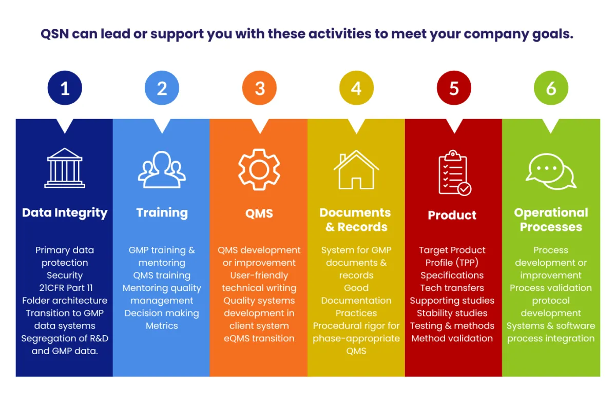 We guide you to establish strong compliance practices and rigor appropriate for each stage of product development using our proven QSN R&D Framework and the Six Pillars of Implementation for R&D.